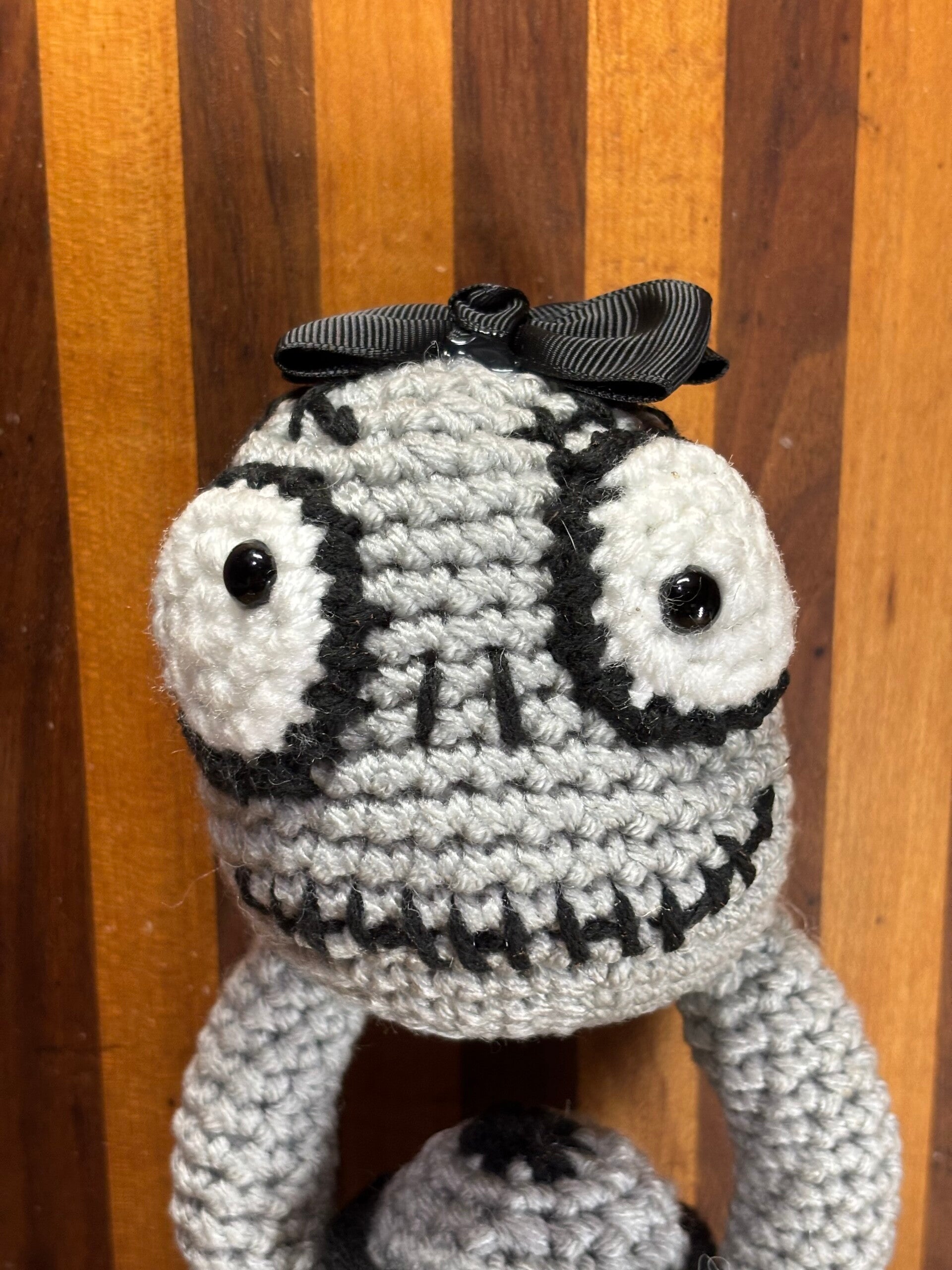 Crafted with exaggerated eyes and a tightly stitched, somber mouth, she radiates an aura of quiet grief. Her